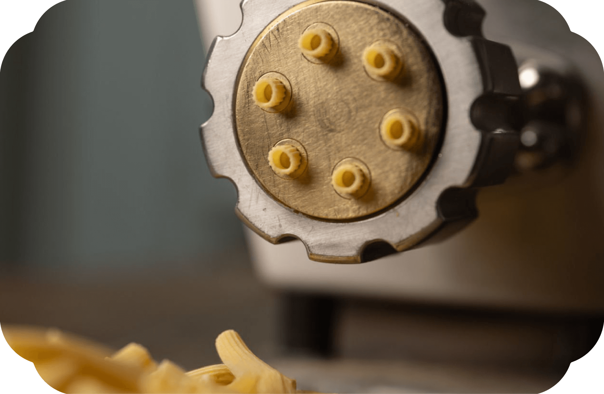 L’impasto viene modellato passando attraverso trafile in bronzo, uno stampo grezzo che dona alla pasta la sua forma e, soprattutto, la sua superficie ruvida e porosa. Questo dettaglio, apparentemente estetico, è in realtà il segreto della capacità della pasta di trattenere il condimento.
