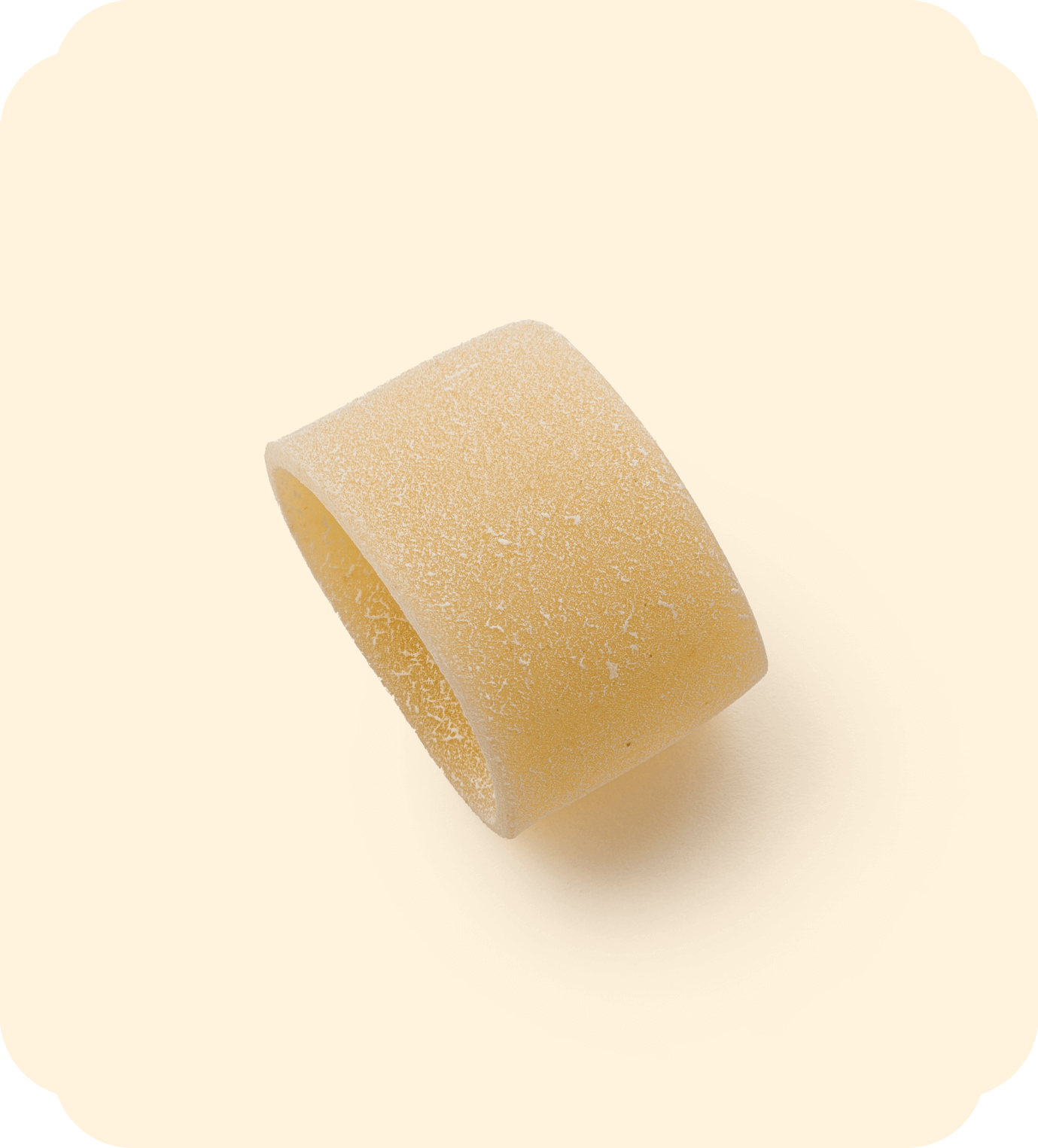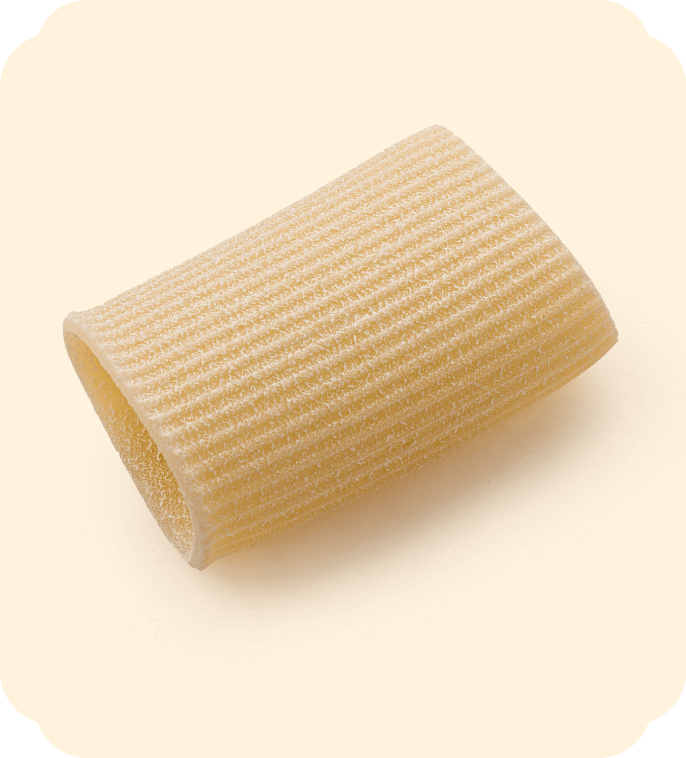 L’impasto viene modellato passando attraverso trafile in bronzo, uno stampo grezzo che dona alla pasta la sua forma e, soprattutto, la sua superficie ruvida e porosa. Questo dettaglio, apparentemente estetico, è in realtà il segreto della capacità della pasta di trattenere il condimento.